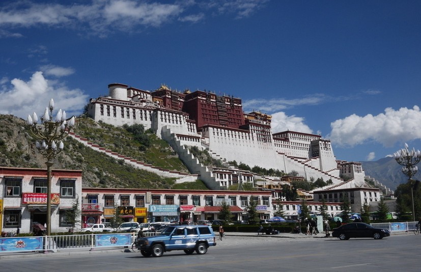 位于拉薩市瑪布日山上,是我國著名的宮堡式建筑群,布達拉梵文意為觀世音圣地。相傳公元7世紀,土蕃贊普松贊干布與唐聯(lián)姻,為迎娶文成公主,在此建宮室,后世屢有修砌。至17世紀中葉,達賴五世受清朝冊封后,又擴建重修,歷時500年始具今日規(guī)模,后為歷代達賴喇嘛的冬宮。布達拉宮分為白宮和紅宮兩部分,全部建筑依山勢修建,群樓高聳,崇閣巍峨,宮體主樓13層,高117米,東西長400米,南北寬350米,全部為石木結(jié)構(gòu),五層宮頂覆蓋金瓦,外觀氣勢雄偉非凡,建筑藝術(shù)別具一格,體現(xiàn)了藏漢文化的融合,是藏族建筑藝術(shù)的精髓.