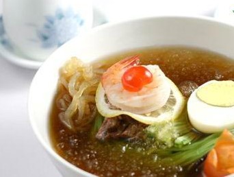 韓國(guó)的冷面想必都聽(tīng)說(shuō)過(guò)。在冰鎮(zhèn)的甜酸冷湯中,放著一團(tuán)細(xì)細(xì)的面條,上面臥著兩塊白煮蛋,還有兩片水梨或蘿卜,十分好吃。冷面主要有用蕎麥面做的平壤冷面和用土豆做的咸興冷面,食用方法也可分為加湯的和用辣椒醬拌的兩種,口感十分筋道光滑。炎炎夏日,盤(pán)腿一坐,來(lái)一碗加冰冷面,爽呆了!|