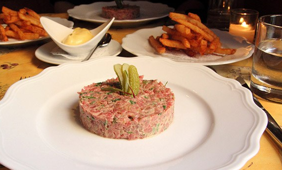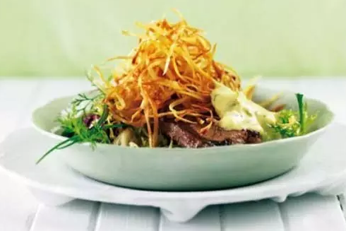 13.蛋黃醬牛排及紅薯絲:“Béarnaise”是一種類似于蛋黃醬的醬料,可以用作烤牛排和炸紅薯絲的調(diào)料,讓它們變成法國小酒館里的一道經(jīng)典菜——牛排薯?xiàng)l(steak frites)。