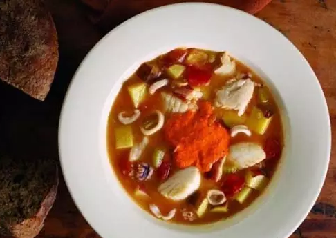 6.辣味大蒜蛋黃醬魚湯:傳統(tǒng)上,這道普羅旺斯燉魚湯是由漁民用當(dāng)天捕獲的海鮮來烹制的。這里介紹的這道魚湯是經(jīng)過改良的家常燉魚湯,以羅非魚、扇貝和魷魚烹制,吃的時(shí)候再加入辣味大蒜蛋黃醬。