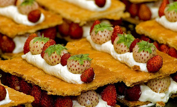 7.拿破侖千層酥:也是一種傳統(tǒng)甜品,幾層酥皮和幾層奶油疊合起來,頂上用白糖和巧克力做出大理石紋理。
