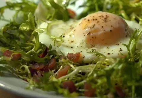 16.碎肉片沙拉:這種沙拉類似于里昂沙拉,不過它的味道更淡一些,因?yàn)樗褂玫娜馐羌幽么笈喔?。做好沙拉之后,在每個(gè)盤子上再放上一個(gè)水煮蛋??梢杂米鞑颓伴_胃沙拉,也可以用作午餐。