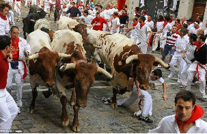 西班牙斗牛:西班牙奔牛節,從每年的7月6日開始舉行,7月14日結束。地點在西班牙東北部潘普洛納城。在節日的9天里,來自世各地的人們穿上白衣褲,,纏上紅腰帶,表示參加的意愿。將6條經過兩年專門馴養的公牛,突然從牛棚中放出,跟在一大群小伙子后面,狂奔亂竄,穿城而過。這些牛非常兇悍,有的牛角被磨尖,甚至露出神經,一觸即痛,有的牛眼睛被抹上辣椒,以激怒它,引發它的野性。