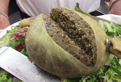 ?哈吉斯: 如果您在蘇格蘭游玩,千萬別錯過著名的“哈吉斯”(或稱肉餡羊肚)。第一次吃時您或許會有些不適應,這個蘇格蘭式的美味是將羊雜(心、肝、肺)、羊脂、洋蔥、燕麥粉和各種調料磨碎攪拌,然后裝進羊的胃中扎緊,放入沸水中煮熟(也有為素食者特別 制作的品種)。在蘇格蘭商店和餐館,這道菜十分常見,英國其他地區也在嘗試著逐步接受這種食物。吃的時候佐以蘿卜、甘藍、土豆,這就是傳統而地道的蘇格蘭大餐了。