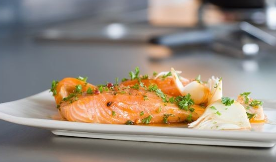楓糖煎三文魚:加拿大有一道名菜叫"楓糖煎三文魚":三文魚先用胡椒、玉桂粉腌了、煎熟,配上綿綿的薯蓉和蔬菜絲,然后再淋上楓糖而成。魚肉的鮮美加上楓糖特有的甜香,即美味又有營養。