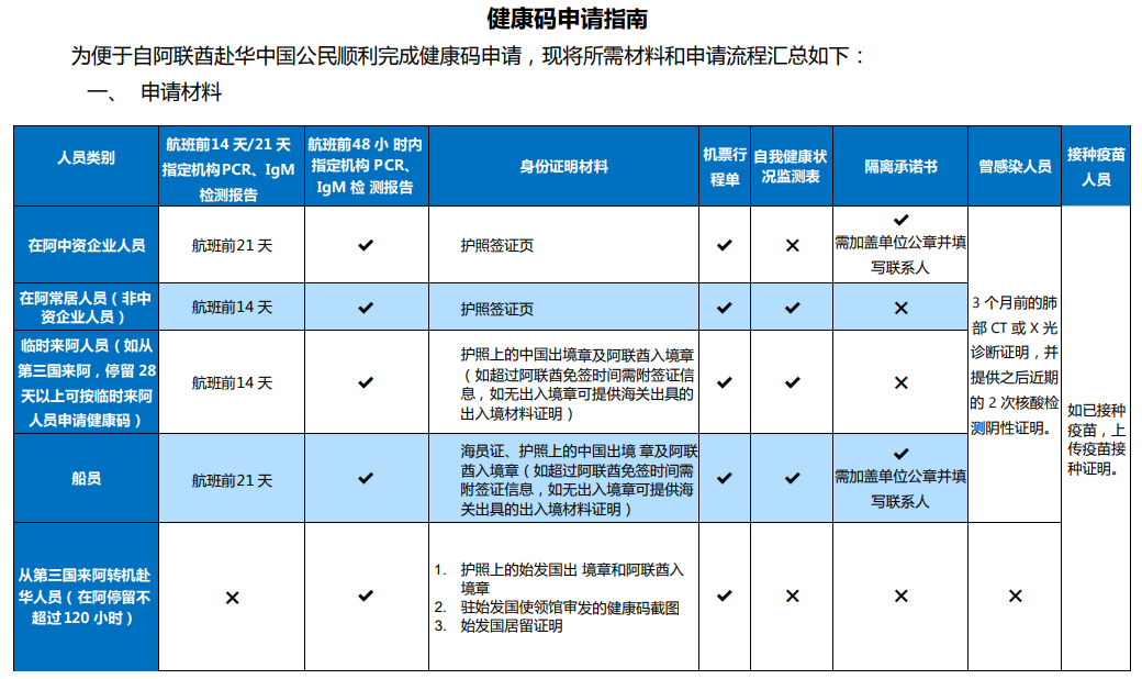 二、非中資企業(yè)項(xiàng)目人員 1、登機(jī)前第14天,指定檢測(cè)機(jī)構(gòu)出具的核酸和血清IgM雙檢測(cè)陰性報(bào)告 2、登機(jī)前48小時(shí)內(nèi),指定的另一家檢測(cè)機(jī)構(gòu)出具的核酸和血清IgM雙檢測(cè)陰性報(bào)告 3、全程機(jī)票行程單 4、在阿長(zhǎng)期居住人員須提供居留證明;自國(guó)內(nèi)臨時(shí)來(lái)阿人員須提供護(hù)照上的中國(guó)出境章、阿聯(lián)酋入境章、所有阿聯(lián)酋簽證延期記錄 5、完整填寫(xiě)并簽名的《自我健康狀況監(jiān)測(cè)表》 6、疫苗接種證明 三、對(duì)于自阿聯(lián)酋出發(fā)、經(jīng)其他國(guó)家和地區(qū)中轉(zhuǎn)2次及以上的人員,駐阿使領(lǐng)館將不予審發(fā)健康碼! 疫情期間,在購(gòu)買(mǎi)機(jī)票前,一定要了解最新出入境政策,如果有迪拜回國(guó)飛行計(jì)劃,但是擔(dān)心遺漏任何程序,或是航班臨時(shí)出狀況,可以致電小編,小編可以為你制定最優(yōu)路線。