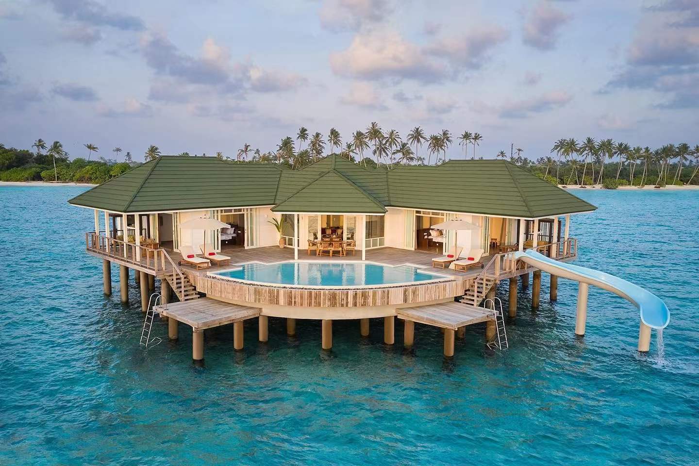 賈尼有大量的滑梯水屋房型,并且他的姐妹島索尼娃富士也修建了少量。在BOOKING上全球評分TOP10!因為是頂奢度假村,所以每一個滑梯房型面積達到了夸張的400平米以上,并且每一棟別墅都有星空遙控電動頂,如果連住4晚,你的荷包至少往10個W走!不過因為馬爾代夫今年3月旅游才開始恢復,所以目前還較為劃算!