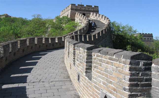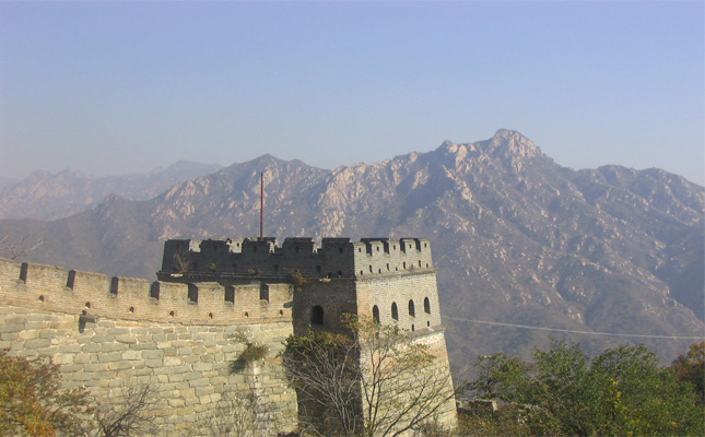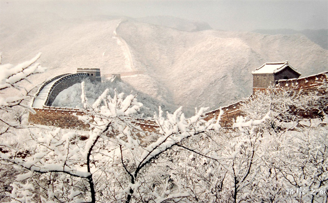 | 長城由山腰直伸山頂,在山頂立一敵樓后,又突然下降,翻身向下返回山腰,又驟然升起,直到海拔940多米的地方,繞了一個大彎,其形狀酷似牛犄角,蒼勁雄渾,人們把它稱之為“牛犄角邊”。長城從“牛犄角邊”繼續往前延伸,經過一個名叫“箭扣”的地方,這里是已達海拔1044米的山峰,兩側陡峭如削。在修筑長城時,必須從山頭的外側斷崖絕壁上通過,又不能把這個制高點留在外面,使用磚石、木材顯然都不行。于是聰明的能工巧匠們,用了兩根大鐵梁擔在斷崖之上,上面再壘砌磚石,這種方法在整個長城修建史上極為罕見。在慕田峪長城東側,長城本來是順山勢伸向東北??墒堑揭粩硺翘幫蝗环殖黾s1000多米的地段,另辟蹊徑擺向東南方向,山勢盡處,突然終止,在盡頭處修了一個甚是堅固雄偉的敵樓。這段千余米的長城被人們稱之為“禿尾巴邊”。這樣長城在此處就形成了三道長城匯于一樓,“三面極目觀巨龍”的景觀。在慕田峪長城“牛犄角邊”的兩側,有一段長城被稱為稱為“箭扣”及“鷹飛倒仰”。墻體全部建在巖石裸露的懸崖峭壁上,長城的坡度大都在50度左右,其中有一節接近90度,幾近垂直,臺階僅有幾尺寬,非勇敢者不敢涉足。 |