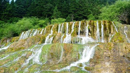 告別迎賓池,沿著曲折的棧道蜿蜒而上,可見到千層碧水沖破密林,順坡而下,在高約10米、寬約60余米的巖坎上飛瀉而來,形成數十道梯形瀑布。瀑布后有一座陡崖,多為馬肺狀和片狀鈣華覺積,色澤金黃,使整個瀑布顯得富麗壯觀。經太陽余輝點染,反射出不同的色彩,遠望如彩霞從天而降,分外輝煌奪目,號稱“飛瀑流輝”。