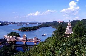 紅楓湖由中、南、北、后四湖組成。其中北湖以島著稱,較有名氣的如鳥島、蛇島、龜島等等都是以形象而命名。沿岸有西漢時代的古墓群以及明代的苗王營壘等名勝古跡至今仍可感受到那種烽火煙城的感覺;南湖以洞聞名,在各類湖群中,紅楓湖以此自居一格,洞中各種怪異鐘乳石令人咋舌;中湖處于南北二湖之間,以奇石異峰著稱,山上松柏蒼翠,峭壁陡巖,頗具氣勢;后湖汊眾多,船行人移,夕陽余輝下,恰似煙雨江南,又一小橋人家。 紅楓湖不但風光依旎,山水可人,而且坐著苗家的小船游覽湖面又別有一番趣味,在船上與友人觀湖景磕瓜子打牌下棋樂趣無窮讓你流連忘返,夕陽時分肚子餓了找個小島下了船更有苗、侗各民族口味任你品嘗,吃飯時還可觀賞極富特色的民族村寨歌舞,另有蠟染竹制工藝品等任你選購。如此美景只應天上有,何不前來享受一番?