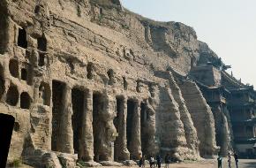 第七窟,窟前建有三層木構(gòu)窟檐,窟內(nèi)分前后兩室。后室正壁上層刻有菩薩坐于獅子座上。東、西、南三面壁上,布滿雕刻的佛龕造像,南壁門拱上的六個(gè)供養(yǎng)菩薩,形象優(yōu)美逼真。窟頂浮雕飛天,生動(dòng)活潑,各以蓮花為中心, 盤旋飛舞,舞姿動(dòng)人。