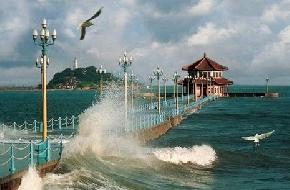 棧橋簡介: 棧橋是青島的象征。位于青島灣中,與市內(nèi)最繁華的中山路成一條直線,由海岸前伸入海,素有“長虹遠(yuǎn)引”之美譽。棧橋初建于光緒十八年(公元1892年),是青島最早的碼頭。經(jīng)1931年改建和1985年整修,現(xiàn)寬8米,全長440米。橋南端筑半圓形防波堤,堤內(nèi)是一座具有民族風(fēng)格的兩層八角亭,金瓦朱壁,盔頂飛檐,題名“回瀾閣”。棧橋劃波斬浪,像一條長龍橫臥于碧海銀波。循橋漸入,仿佛走進(jìn)大海的懷抱;佇立閣旁,層層巨浪澎湃涌來,拍打堤壩,擊起萬千碎玉;