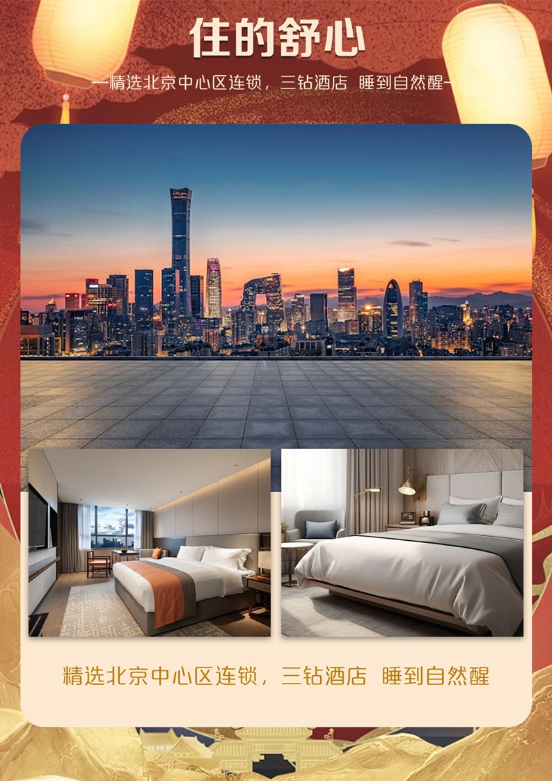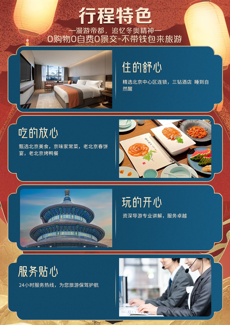 【皇家惠游】-北京品質5日游-不帶錢包游帝都 0自費O購物O景交 皇家惠游 O 購物 0 自費 0 景交 O 暗店 —漫游帝都,追憶冬奧精神…… 住的舒心:精選北京中... |