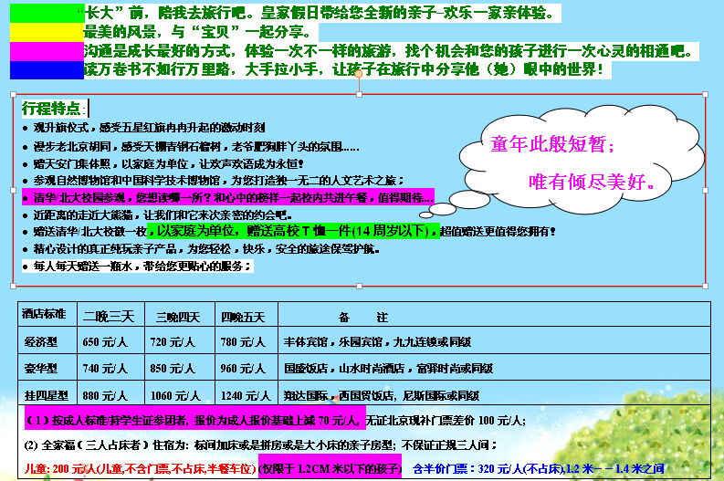 | 合同附件 | 安全保障卡 安全須知 北京市國內旅游合同樣本 出境旅游合同樣本 | 發票說明 | 按照國家相關規定,本產品提供旅游發票,不提供其他類目發票 |