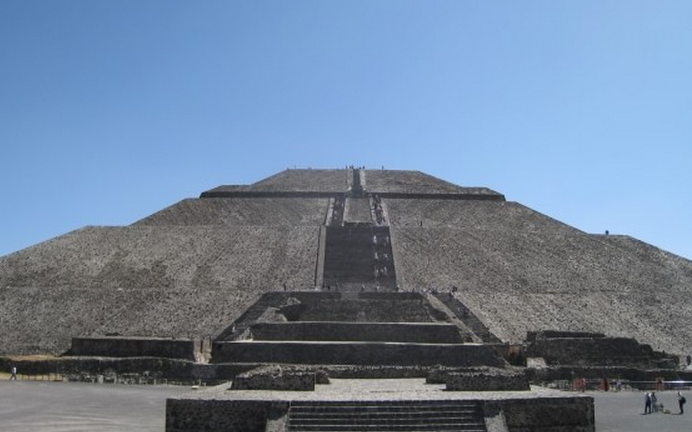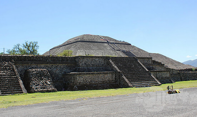 氣勢(shì)恢宏的太陽金字塔(底座225×222米)是世界第三大金字塔。它挺立在大道東側(cè),高達(dá)63米(原來的高度是75米),體積有一百萬立方米。它是特奧蒂瓦坎古城遺址中規(guī)模最大的建筑物,是為了舉行宗教儀式而建,平坦的頂部原本應(yīng)該有一座神廟。