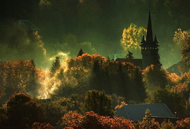 清晨迷霧之中的森林將教堂輪廓襯托的愈發(fā)明晰,好似吸血鬼故事中的場景一般。